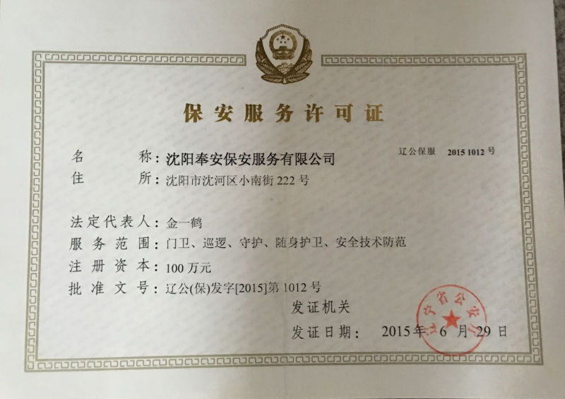 沈陽奉安保安服務(wù)有限公司(原沈陽市沈河區(qū)保安服務(wù)公司)創(chuàng)建于一九八八年八月,是遼寧省公安廳、沈陽市公安局批準(zhǔn),工商行政部門登記注冊,全市首家具備保安資質(zhì)的特殊性服務(wù)企業(yè),隸屬于沈陽市沈河區(qū)政府直管的全民國有企業(yè),現(xiàn)為中國保安協(xié)會會員單位和省保協(xié)、市保協(xié)常務(wù)理事單位:在全市同行業(yè)中率先通過ISO國際質(zhì)量認(rèn)證,是市工商局批準(zhǔn)的“重合同守信用”免檢單位和沈陽市政府采購中心保安服務(wù)項目重點(diǎn)競標(biāo)單位;擁有一支專業(yè)化、標(biāo)準(zhǔn)化、職業(yè)化的高素質(zhì)保安隊伍,是公安機(jī)關(guān)重要的輔警力量。